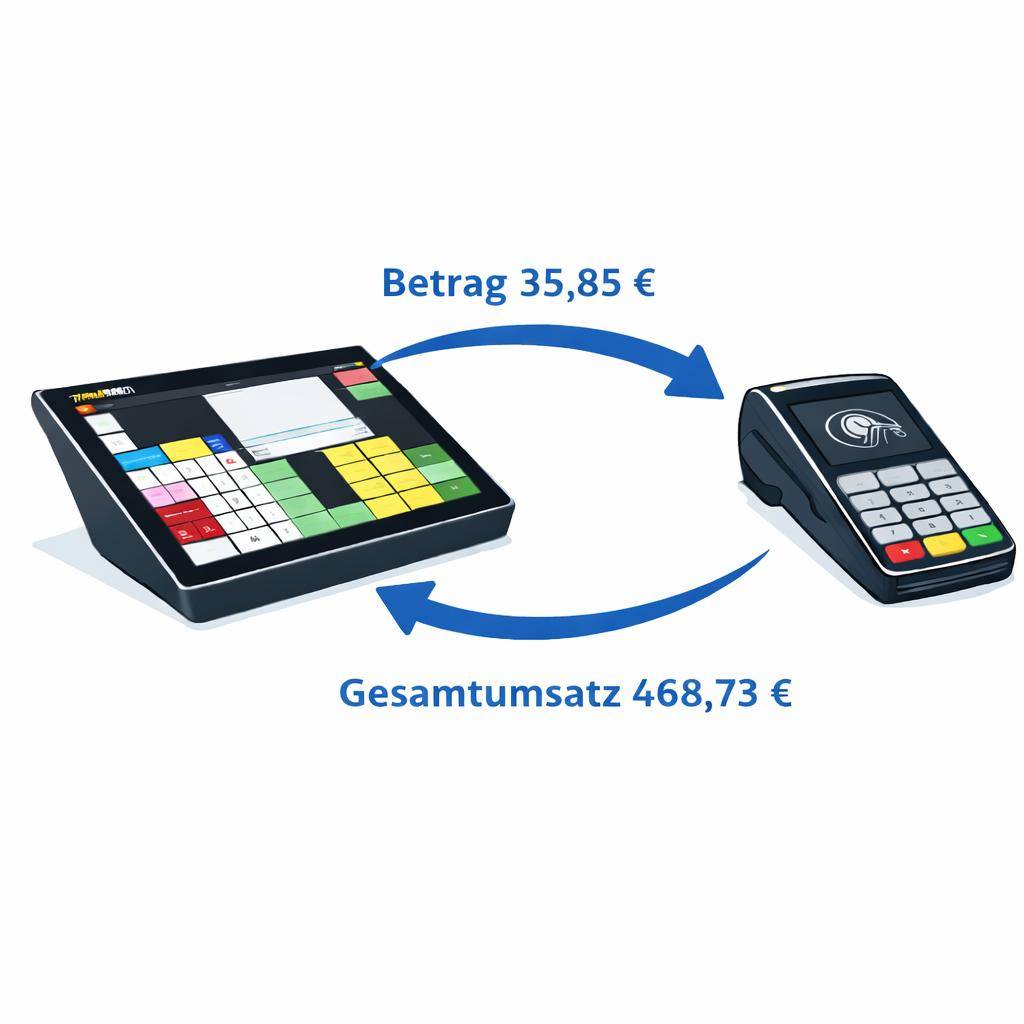 Der große Vorteil: Der Zahlbetrag wird automatisch von der Kasse an das Kartenterminal übertragen. Du musst nichts mehr eintippen, sparst wertvolle Zeit und sorgst gleichzeitig für einen professionellen und reibungslosen Checkout. Gerade in Stoßzeiten bedeutet das: kürzere Wartezeiten, schnellere Abläufe und zufriedenere Kunden.